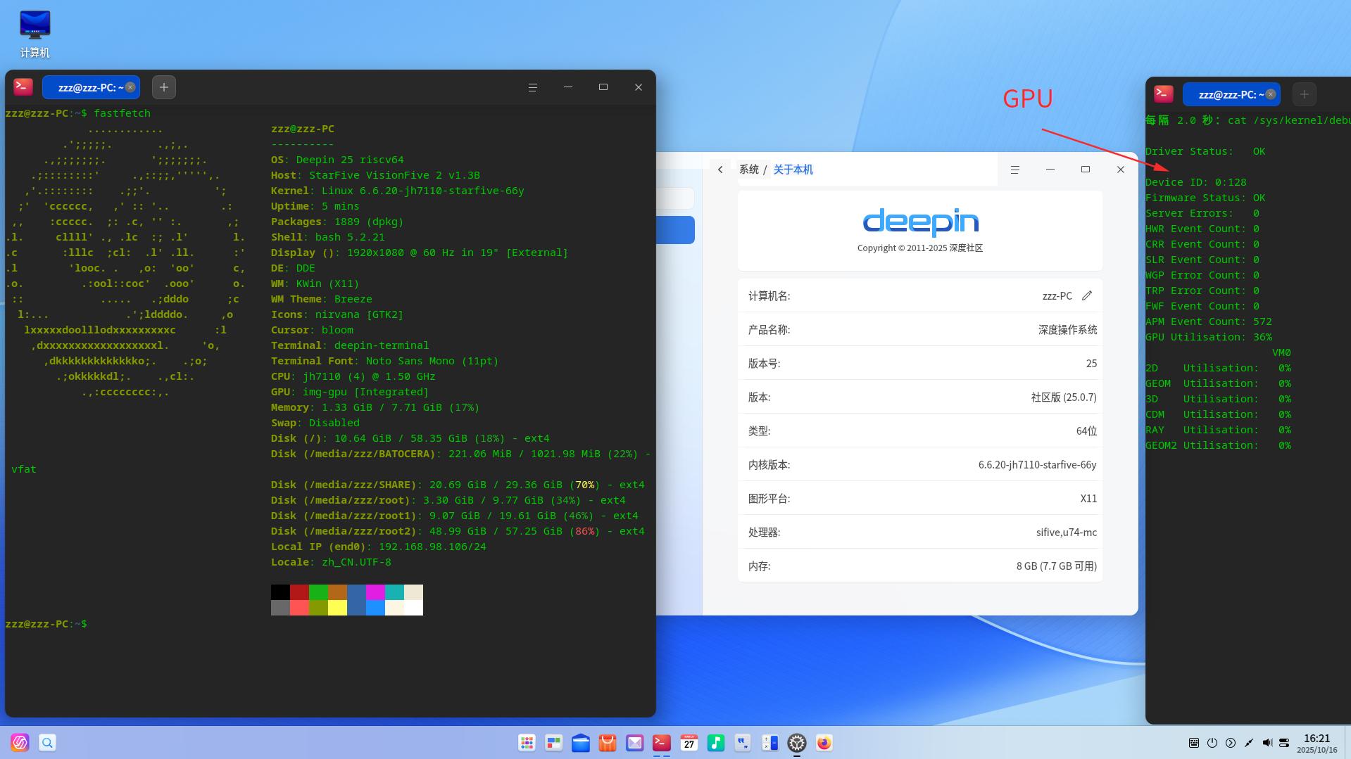 图上系统是deepin for jh7110 2025年6月的技术预览镜像 ,并升级到10月16日的最新版本。系统内置了VF2-GPU-Xorg驱动。通过观察GPU使用情况,也许Deepin X11的桌面环境并不适用于VF2, 拖动系统设置窗口,在屏幕上乱晃动,很轻松的就能把GPU使用率拉上50%–87%。