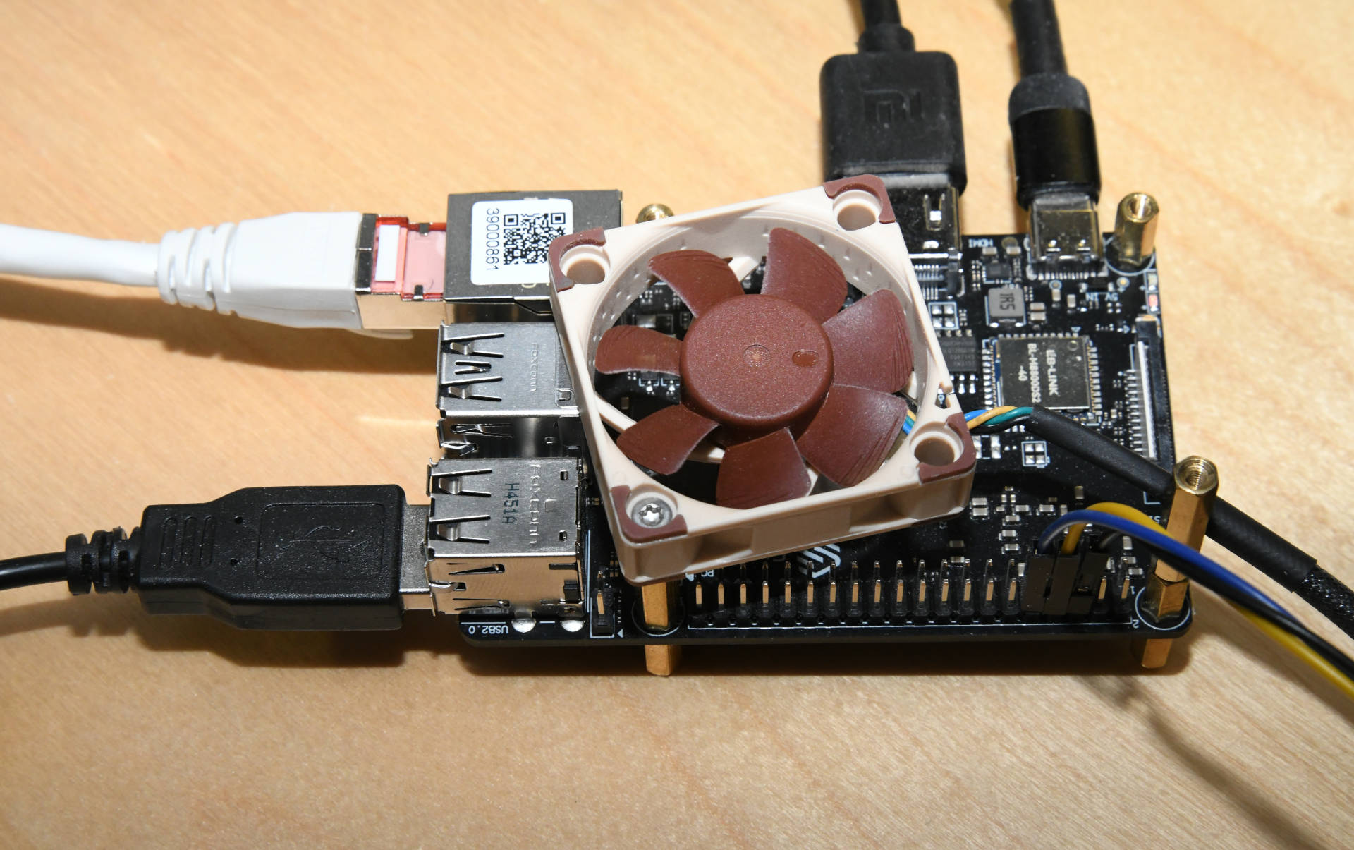 To cool the VisionFive lite, I mounted a small 40mm 12V fan from Noctua using M 2.5 standoffs and powered it with a USB adapter from Noctua (Noctua doesn’t allow this from a technical point of view, because the fan is 12V).