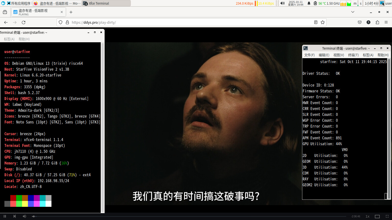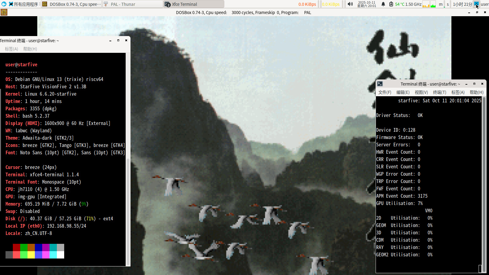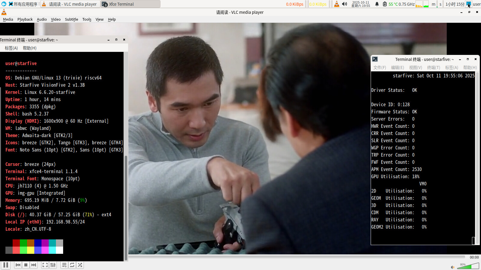 图上系统是deepin for jh7110 2025年6月的技术预览镜像,并升级到10月16日的最新版本。系统内置了VF2-GPU-Xorg驱动。通过观察GPU使用情况,也许Deepin X11的桌面环境并不适用于VF2, 拖动系统设置窗口,在屏幕上乱晃动,很轻松的就能把GPU使用率拉上50%–87%。