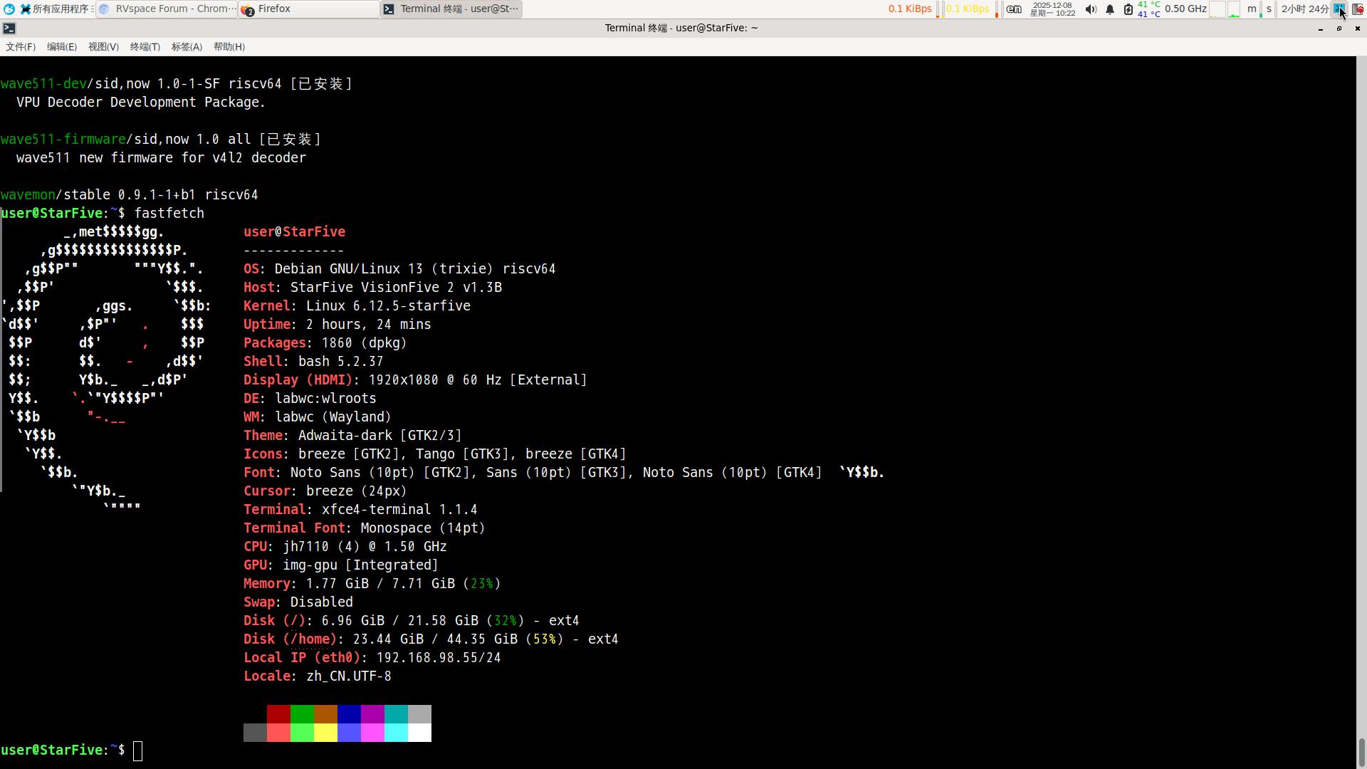 折腾了几天,我综合v0.15.0-engineering-release-wayland - 202510两个版本,及debian13(稳定版),魔改出我认为最合适的VF2-debian系统, 比ubuntu 2404-vf2/vf2l更好用,毕竟ubuntu2404的主体是1年半前的产品(我能理解starfive遵循稳定第一的理念)。魔改内容我只列表: