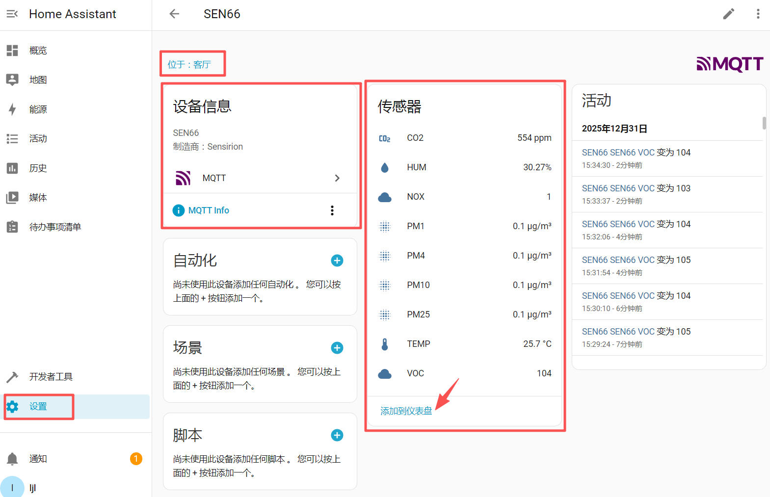 Home Assistant:通过 MQTT 集成,实现 SEN66 传感器数据卡片自动获取,实现物联网环境气体监测。