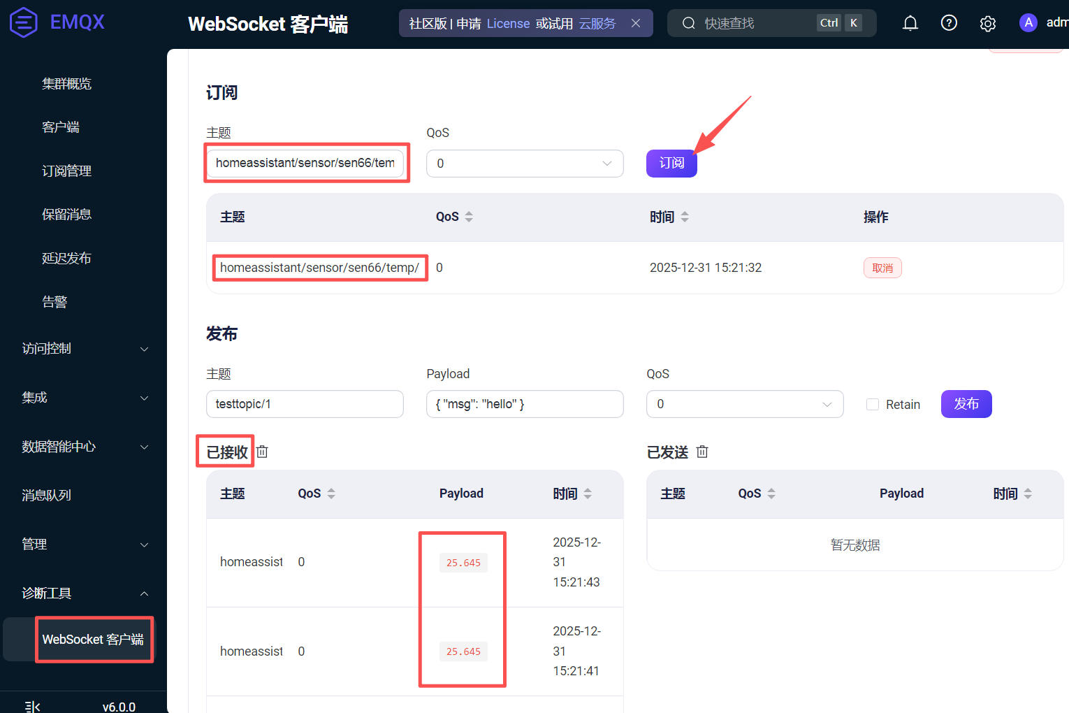 homeassistant/sensor/sen66/temp/state,点击订阅按钮; -