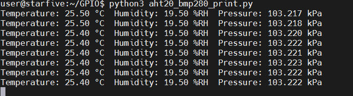 print("Temperature: {:.2f} °C Humidity: {:.2f} %RH Pressure: {:.3f} kPa".format(temp, hum, pressure/1000))