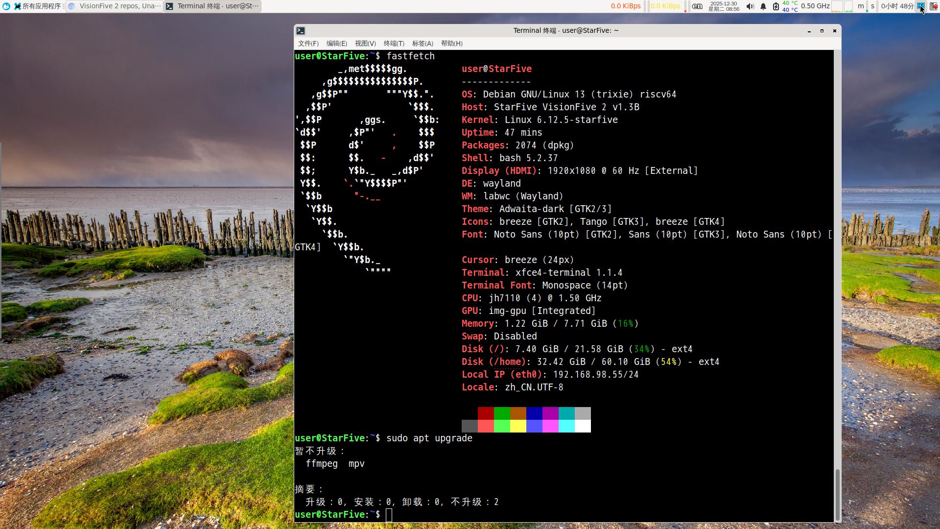 Actually, I use Debian Trixie [stable] myself and haven’t fully applied StarFive’s downgrade scheme. I did this to ensure that when using VLC (3.0.21-2-SF1) and MPV (0.35.1-4) for hardware decoding, the GPU and CPU usage stays below 30-40%.